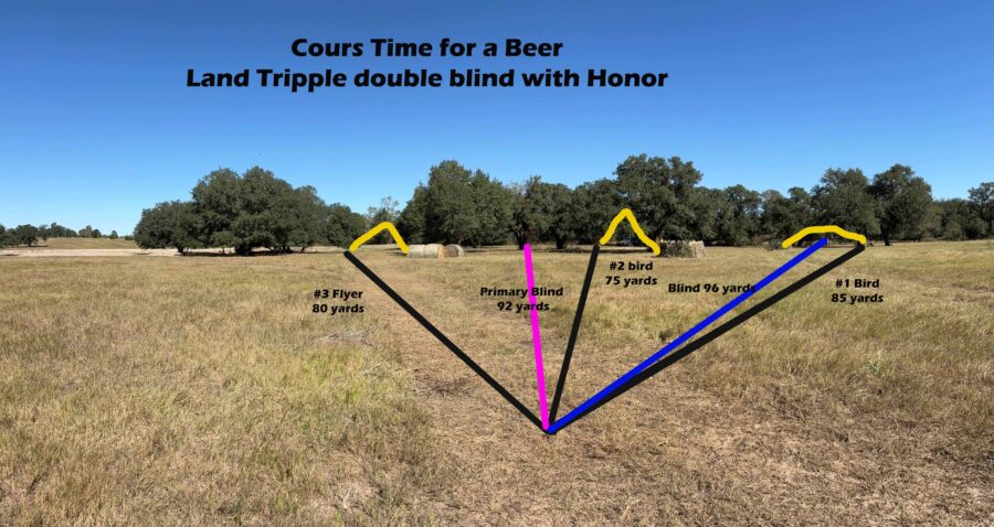This test is a land triple with a double blind and an honor. Bird number one, dead bird is right mark and is thrown left to right at 85 yards. Bird two, dead bird is the middle mark and thrown right to left at 75 yards.