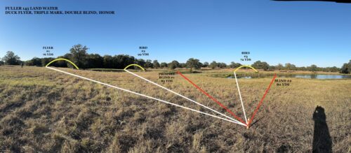 Fuller 145 Land/Water This test is a Land/ Water Triple, with a duck flyer, double blind and honor. Bird #1 is a duck flyer from the left station, thrown right to left and lands approximately