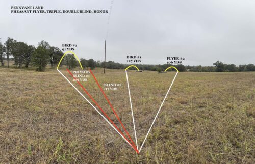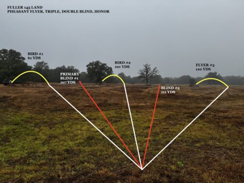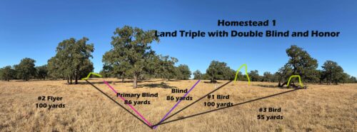 Homestead 1 This test is a land triple with a double blind and honor. Bird number one, dead bird is the middle mark and is thrown left to right at 105 yards. Bird number two